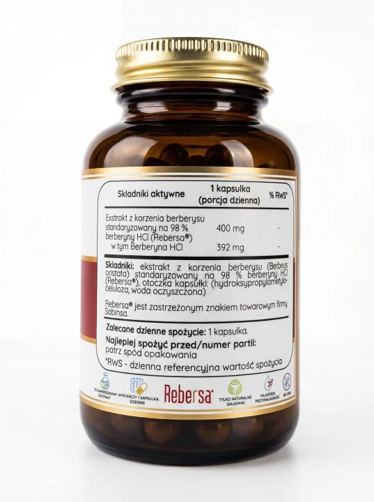 Produkt zgłoszony do Głównego Inspektoratu Sanitarnego (GIS). Berberyna Rebersa nie zawiera składników pochodzenia zwierzęcego, kapsułka jest roślinna (HPMC), produkt bez GMO, glutenu i laktozy. Szklane opakowanie chroni składniki aktywne przed światłem.