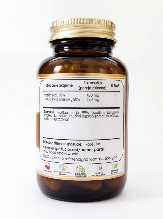 - 480 mg maślanu sodu w 1 kapsułce - standaryzacja na 99% czystości