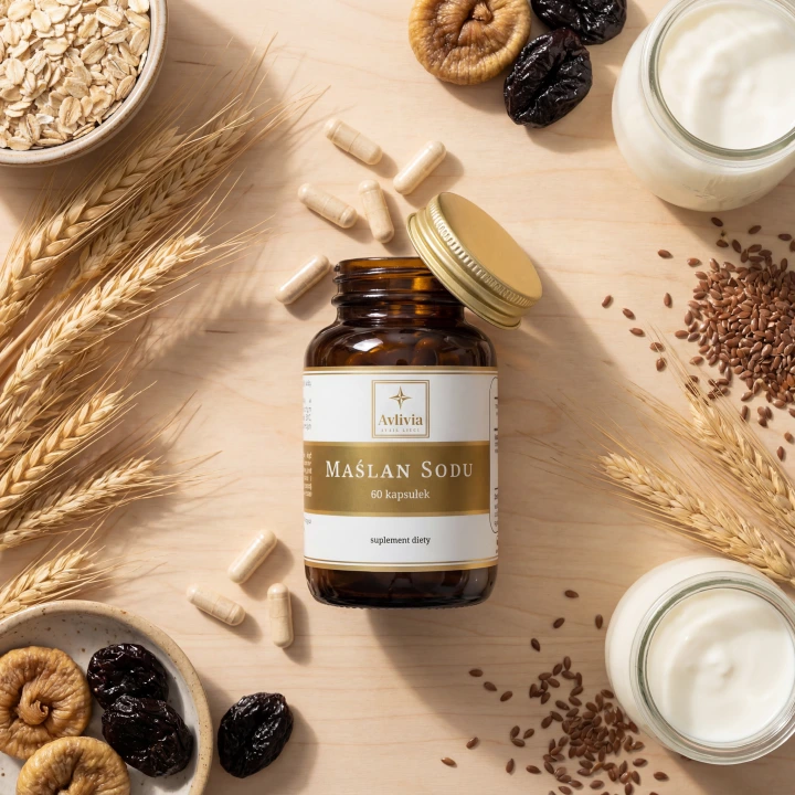 Kwas masłowy (butyrat) to krótkołańcuchowy kwas tłuszczowy (SCFA), który naturalnie powstaje w jelicie grubym podczas fermentacji błonnika pokarmowego przez bakterie jelitowe. Jest głównym źródłem energii dla kolonocytów - komórek nabłonka jelita grubego. Gdy dieta jest uboga w błonnik, produkcja kwasu masłowego spada, co może wpływać na kondycję bariery jelitowej.