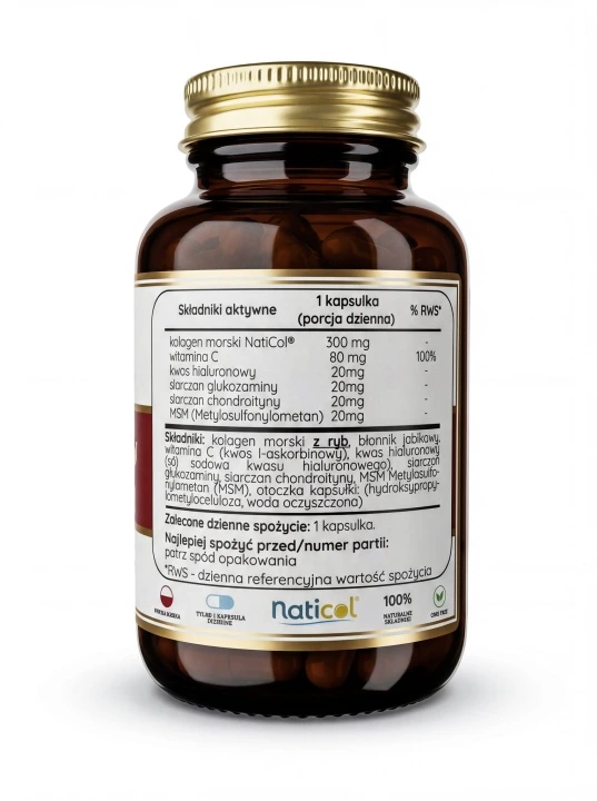 Naticol® to francuski kolagen morski od Weishardt Group (180 lat tradycji). Cząsteczki <4000 Da zapewniają wysoką biodostępność. Dodatkowo witamina C wspiera produkcję kolagenu, a glukozamina, chondroityna i MSM dbają o stawy i chrząstki.